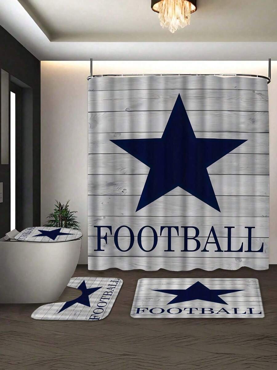 Conjunto de cortina de chuveiro com estampa de estrela de futebol, 1/3/4 peças, à prova d'água, lavável, para decoração de banheiro, com cortina de privacidade para janela, acessórios para banheiro, tecido de poliéster à prova d'água, tapete de banho antiderrapante, tapete higiênico em formato de U, divisória de banheiro, acessórios decorativos, decoração moderna para sala de estar, cortina suspensa, adequada para decoração de casa, decoração de banheiro, decoração de Natal, decoração para feriados e do dia a dia