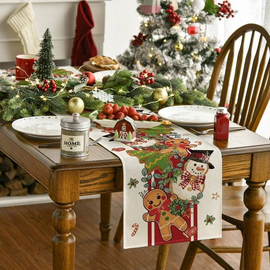 1 peça de caminho de mesa de Natal fofo em formato de boneco de neve de gengibre, decoração sazonal para árvore de inverno, adequado para decoração de mesa de jantar de cozinha para reuniões familiares, tamanho 33 x 277 cm