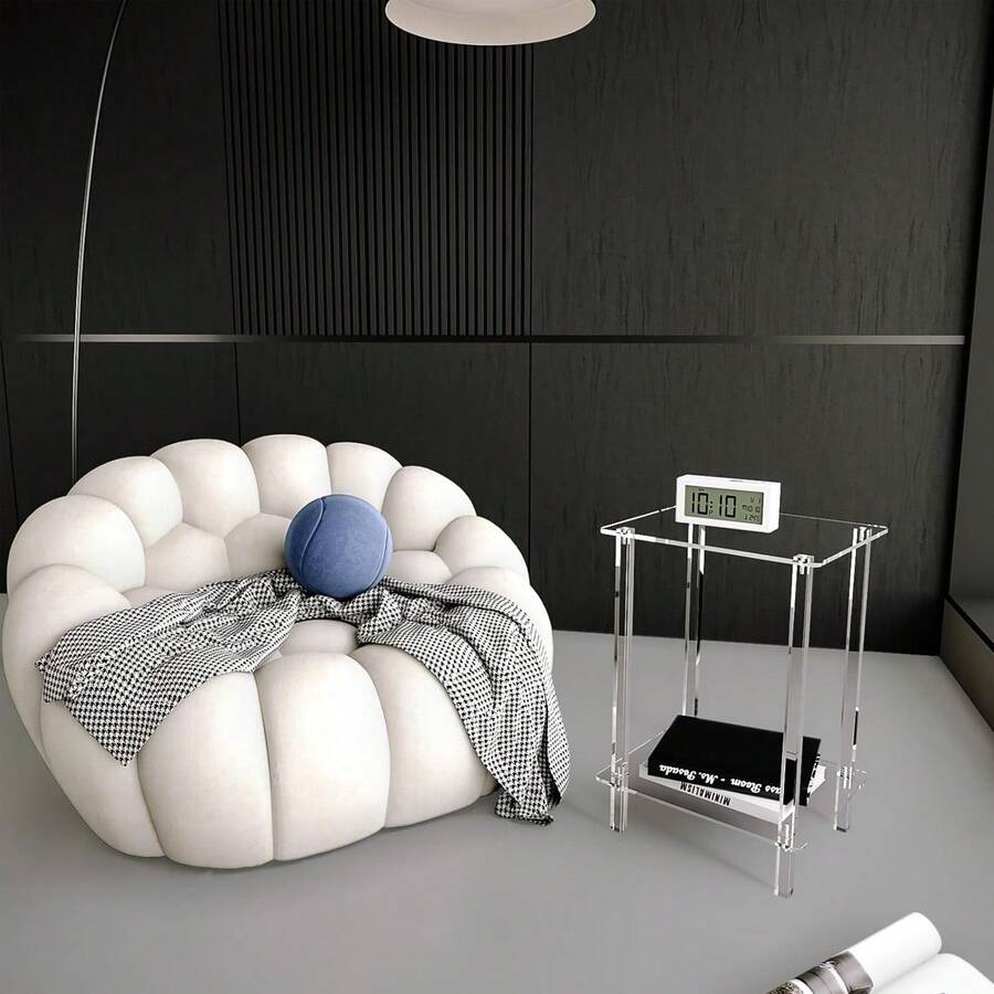 Mesa lateral pequena em acrílico transparente, com suporte para revistas/mesa de cabeceira/mesa de chá, ideal para sala de estar, quarto e decoração de espaço ao lado do sofá. Design moderno e minimalista com prateleira transparente para armazenamento, otimizando espaço. Leve e fácil de montar, com estrutura resistente. Perfeita para ambientes pequenos.