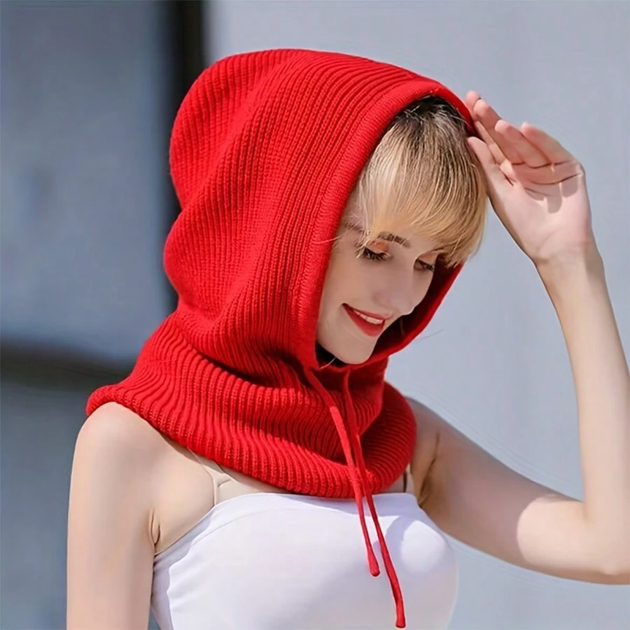 Conjunto de gorro e cachecol de malha de cor sólida feminino, 1 peça, grosso e quente, proteção auricular, versátil com capuz para outono/inverno