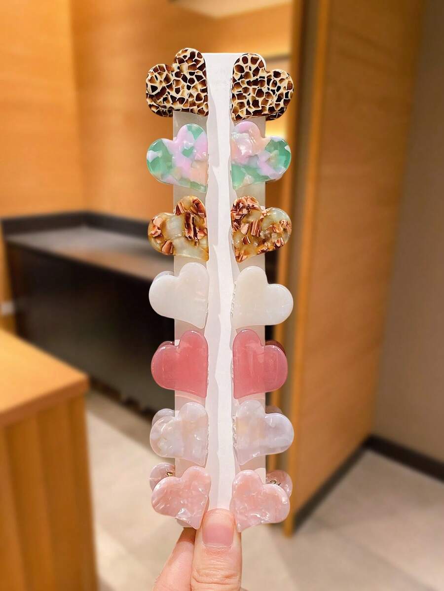 Conjunto de 2 presilhas de cabelo femininas multicoloridas em formato de coração com estampa de leopardo e detalhes em formato de coração. Design simples e moderno, ideal como acessório de cabelo para presentear meninas e perfeito para usar no dia a dia.