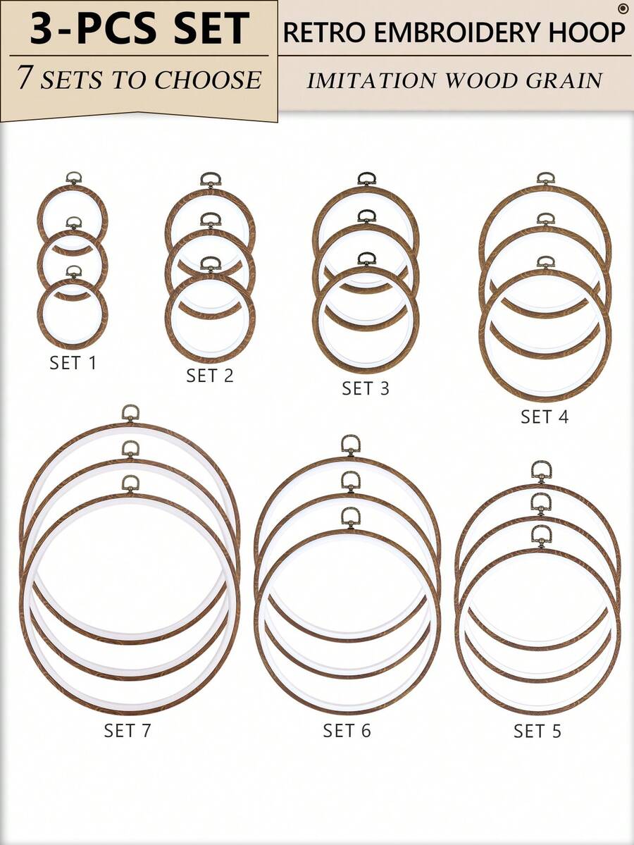 3 peças DIY Handmade Round Brown Retro Wooden Grain Cross Stitch Bordado Hoops, 7 opções de tamanho, material ABS + PVC de alta qualidade e durável, gancho de metal para pendurar, adequado para Halloween, Natal, chaveiro de telefone, bolsa, decoração de cabelo, mesa e decoração de carro