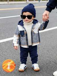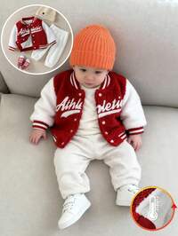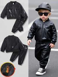 Playful PalsSHEIN Playful Pals Conjunto de 2 peças de jaqueta com forro térmico brilhante para meninos, outono/inverno, e calças com forro térmico e cós elástico, adequado para escola, casual, personalizado, manga comprida, moda urbana, 6 meses a 3 anos, roupa infantil, roupa infantil