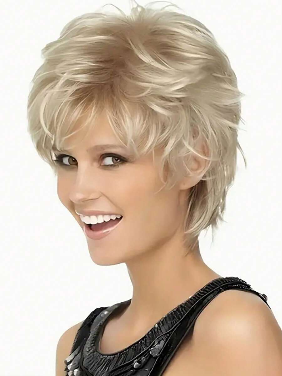 Conjunto de perucas curtas e fofas, com gradiente dourado, para mulheres da moda, com franja lateral e cabelo liso, perfeito para usar com perucas e encenações. Uma peruca completa feita de fibra sintética sem renda.