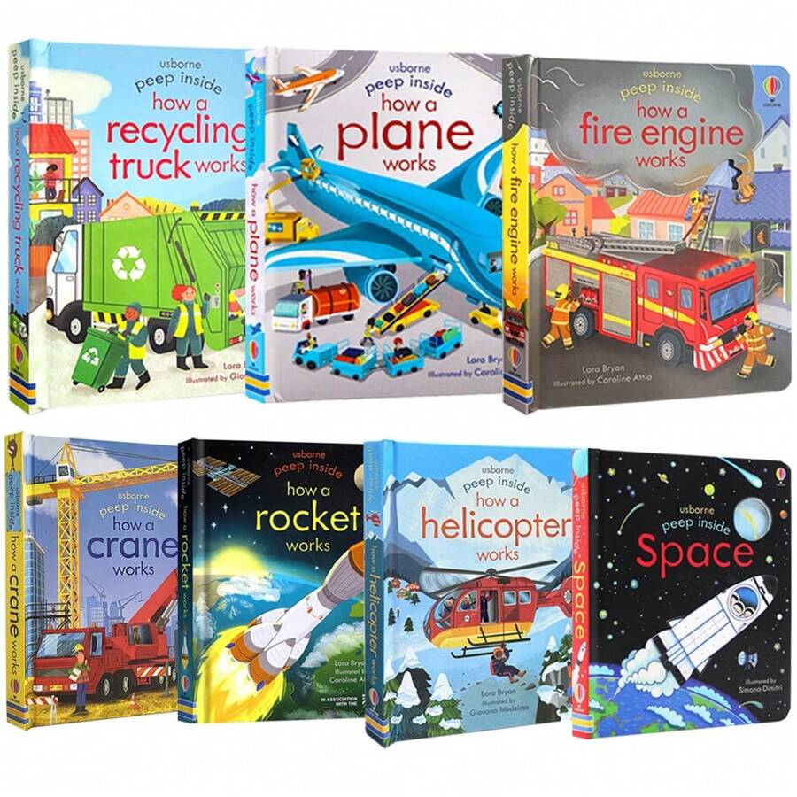 Lachilly Série de livros Peep Inside da Usborne - Como funciona um avião/ Como funciona um caminhão de reciclagem/ Como funciona um carro de bombeiros/ Como funciona um guindaste, livro ilustrado infantil, atividade interativa pré-escolar, livro de inglês para aprendizagem precoce