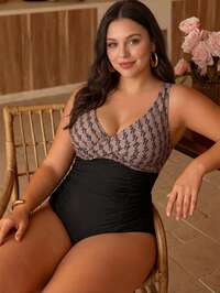 Swim ChicciaMaiô feminino plus size - cor sólida com estampa floral lateral, traje de banho esportivo para praia, preto, fitness, emagrecimento, estampa tropical, elegante, casual, de malha, para resort de praia, esportes e viagens, primavera/verão