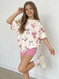 Emery Rose Kids Emery Rose Kids 2 peças/conjunto de camiseta e shorts de manga curta solta com design de laço casual para meninas pré-adolescentes, roupa de verão