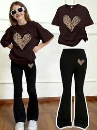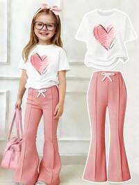 Conjunto casual para meninas pré-adolescentes: camiseta de manga curta com estampa de coração e calça flare.