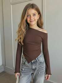 SHEIN Girlism Camiseta casual justa para meninas adolescentes com gola redonda e babados, manga comprida e flare