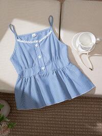 SHEIN Esta é uma regata feminina oversized com listras azuis e brancas, sem alças e com gola adornada com pequenos detalhes em renda. A parte frontal da peça apresenta botões semiabertos e um corte em A que acentua a cintura, tornando-a perfeita para meninas usarem em ocasiões casuais do dia a dia ou em férias de verão.
