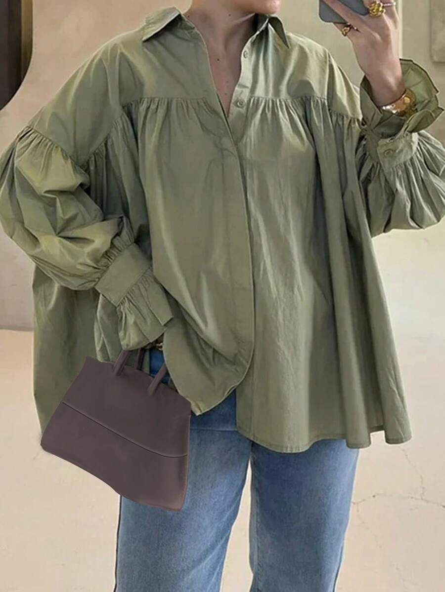 Camisa casual feminina com botões decorativos e mangas sino, blusa de poliéster de cor sólida