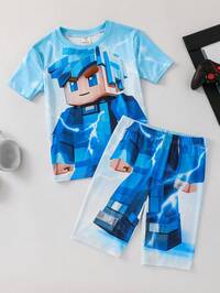 SHEIN Conjunto de pijama infantil/pré-adolescente, 2 peças, casual, para o dia a dia, versátil, confortável, estampado, gola redonda, solto, manga curta, blusa e shorts, malha, ajuste justo #1 Mais Vendido